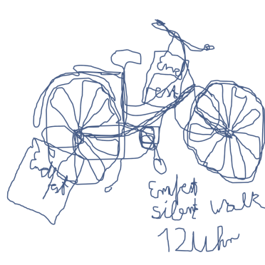 Würden Menschen sich spontan entschließen mitzumachen? Würde meine kleine Installation mit Fahrrad, Plakaten und Kreidezeichnung auf dem Pflasterboden ausreichen, um anzusprechen? Beim Aufbau der Installation entwickelten sich ein paar kurze, auch interessante Gespräche mit Menschen, die mein Tun beobachteten. Sie erfuhren vom Erdfest. Niemand aber hatte Zeit mitzumachen. Also habe ich zweimal alleine einen Silent Walk durchgeführt, wobei eben der zweite Teil, die Partner, fehlte. Dennoch habe ich intensive Verbindung aufgenommen zum Ort und zu mir, der Gehenden ...