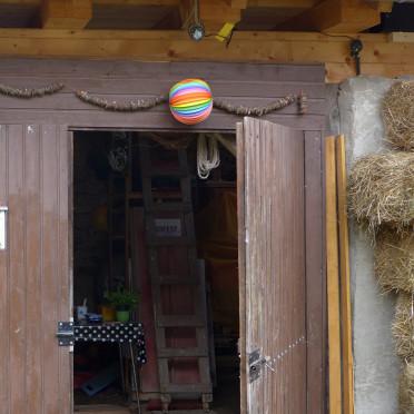 Mein vordergründiges Ziel war, ganz bewusst Menschen anzusprechen, die von sich aus eher einen Bogen um Nachhaltigkeitsthemen machen und aufzuzeigen: Das Ganze geht auch ohne Moralisiererei, ohne mahnenden Zeigefinger! Wir feiern ein rauschendes Fest, haben riesig Spaß und verursachen trotzdem so gut wie keinen Müll, und es landet nichts von dem guten Essen im Abfall. Wurst vom regional wirtschaftenden Metzger (da ist der Odenwald gut ausgestattet!), gegrillt auf der Holzasche des Lagerfeuers (keine gekaufte Grillkohle), die mitgebrachten Salate (in Tupper bzw. Schüssel mit Deckel ohne Alu drauf), Getränke ausschließlich in Glasflaschen, das Bier aus der Region. Sitzmöbel haben wir aus den vorhandenen Paletten gebaut, der Bauer im Ort war eingeladen und hat zusätzlich Strohballen mitgebracht. Keine Geschenke, kein Geschenkpapier. Das hat tatsächlich geklappt! Auf Servietten und Einweggeschirr wurde verzichtet, allerdings: Es gab Pappteller! Die lagen seit Jahren originalverpackt in meinem Schrank und niemand weiß mehr, wer sie wann wofür mal gekauft hatte. Das war wirklich so, und da haben wir sie nun benutzt. Sonst ist nichts angeschafft worden, die Meister der kreativen Improvisation haben bei der Schaffung einer Party-Zone ganze Arbeit geleistet. Die Scheune mit der Wiese davor bot natürlich auch ideale Voraussetzungen. Gitarre wurde viel gespielt, es gab auch Charts-Musik vom Band. Es gab Kerzen und Feuer, aber auch ne Diskokugel und Lichterketten ... Die Gegensätze verbinden, Tabus einfach brechen, darum ging es auch! Das hat was Verbindendes, Fronten Aufbrechendes ...