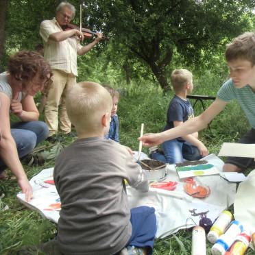 Bei meditativem Geigenspiel nahmen besonders die Kinder begeistert das Malangebot (auch mit Erde plus Kleister) an und ließen sich die kleinen Erdbewohner in einer Scholle Erde zeigen.