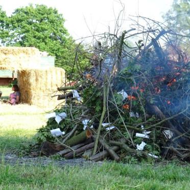 Im Kreis stehend erinnerten wir uns an die Erde zu unseren Füßen und gestalteten dann unseren DANK an die Fruchtbarkeit, an die Geschenke, die uns ernähren. Dies war so direkt und sommerlich erfahrbar auf dem weiten Acker in der Sonne und im warmen Sommerwind! Die winkenden Kinder von der Trecker-Rundfahrt waren bildhaftester Ausdruck der Lebensfreude, und unsere gestalteten Zettel mit der Dankbarkeit für die Kreisläufe des Lebens, für die Lebendigkeit wurden mit den Flammen des Feuers in unserer Mitte in den großen, weiten Raum geschickt.