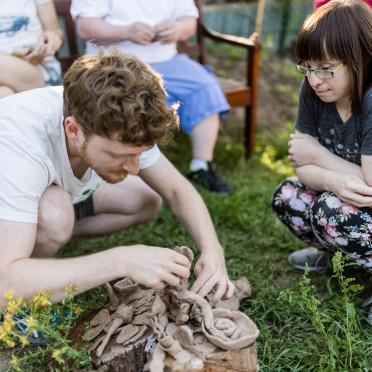 Dann bauten wir gemeinsam eine Tonskulptur auf einem alten Baumstamm. Es entstand ein kleines Abbild der Vielfalt des Planeten mit Bäumen, Tieren, Menschen und Symbolen. Ein wahres Erdkunstwerk, das Kollektivität und Diversität gleichzeitig wiederspiegelte.