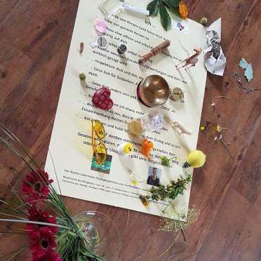 Danach unternahmen wir einen »Spaziergang mit sich selbst im inneren Dialog« in der Natur, von dem jede*r einen Gegenstand mitbrachte und die Gedanken, die er/sie sich auf dem Weg dazu gemacht hat, einbrachte.