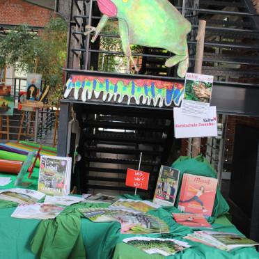 Viele Kinder, Eltern und andere Festteilnehmer*innen beteiligten sich daran, unser Pagodenzeltdach zu gestalten. Der Büchertisch mit den vielen tollen Zeitschriften der ERDFEST-Medienpartner fand regen Zuspruch, wobei die meisten sich wunderten, dass die Magazine kostenlos mitgenommen werden durften. Dadurch ergaben sich etliche Gespräche, in denen wir den Besucher*innen die ERDFEST-Initiative nahebringen konnten.