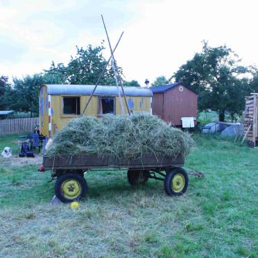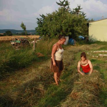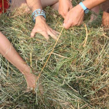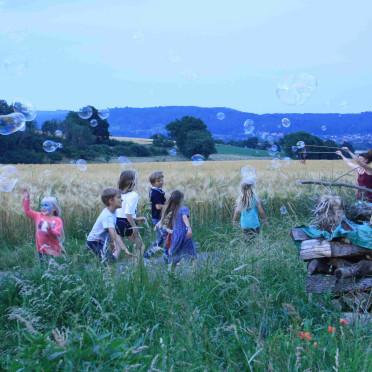 Am Nachmittag wurde in einer gemeinsamen Aktion das Tage zuvor gesenste Heu per Hand in kleine Heuballen zusammengewickelt und ins Trockene gebracht. Unsere Träume und Visionen einer enkeltauglichen Welt konnten mit Riesenseifenblasen in die Lüfte aufsteigen, an abendlichen Feuern wurden Geschichten erzählt und Musik gespielt. Es war ein kleines und feines Fest für die Erde und uns Menschen rund um die Allmende Holzhausen.