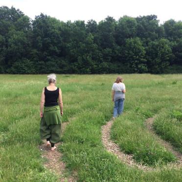 Wir waren sechs Frauen, zum Picknick kam dann noch mein Mann dazu. Während des Essens tauschten wir uns über unsere Erfahrungen beim Durchschreiten des Labyrinths aus. Es war berührend zu hören, was jede erlebt, dass jede ihre ganz eigenen Eindrücke hatte. Da war z.B. der Schmerz unter den Fußsohlen, der durch das Verweilen und Hineinentspannen kleiner wurde, oder die Erleichterung und der Stolz beim Ankommen in der Mitte. Sich die bewusste Erlaubnis geben, den vorgeschriebenen Weg zu verlassen und statt dessen einen zu wählen, der für die Füße eine Wohltat war: Ich bleibe im Fluss der vorgeschriebenen Richtung, gehe jedoch meinen eigenen Weg. Ich darf es mir leicht machen. Die ersten beiden Biegungen des Weges hatten für mich eine besondere Intensität, sie waren wie die Schwellen in eine neue Lebensphase: vom Kind zum pubertierenden Mädchen und dann zur Frau. Von da an wurde der Weg unbequemer und schwerer zu gehen, es gab Hindernisse und ich musste mich entscheiden: Gehe ich darüber hinweg, weiche ich aus, oder räume ich das Hindernis beiseite ....