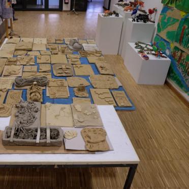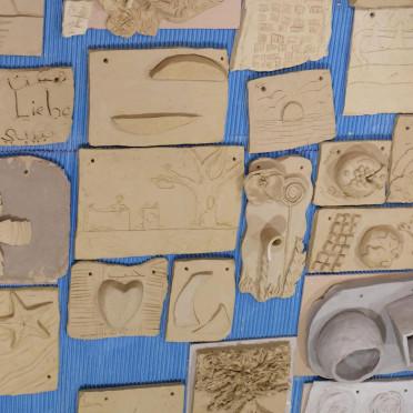 Das Team der Kunstschule nahm das Erdfest zum Anlass, um nach dem langen Lock down mit Dozent*innen und Teilnehmer*innen an etwas Gemeinsamem zu arbeiten und darüber eine Begegnung zu schaffen. Im Zentrum stand die Erde als Material Ton. Inhaltlich wurde die ERDE als Welt aufgegriffen. Auf ca. DIN A4 großen Reliefplatten modellierten insgesamt 70 Kinder, Jugendliche und Erwachsene Begegnungen mit Menschen, Gegenständen, Tieren, Pflanzen, Formen.