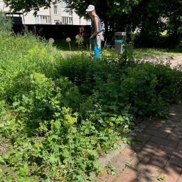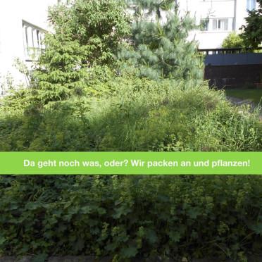 Es war ein gelungenes Erdfest für uns. Durch den Aushang im Hausflur sind spontan zwei Nachbarn, Azeb und Asfan dazugekommen. Das Gärtchen befindet sich genau vor ihrem Fenster. Claudia hatte für die Pflanzaktion größeres Werkzeug und Ableger von insektenfreundlichen Pflanzen wie z.B. Akelei und Bohnenkraut beigesteuert. Gemeinsam wurde das zugewucherte Beet aus Frauenmantel, Riesenzierlauch und Ziergräsern wieder lichter gemacht und von vielen Ackerwinden befreit.
