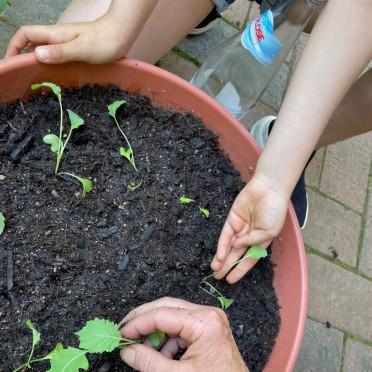 Eine insektenfgreundliche Pflanze von meiner Mutter hat hier auch einen neuen Platz gefunden. Die siebenjährige Hannah hat sich auch für unsere Aktion interessiert und Kohlrabi-Setzlingen vereinzelt. Jetzt kümmert sie sich um´s Gießen der Pflänzchen - wie schön.